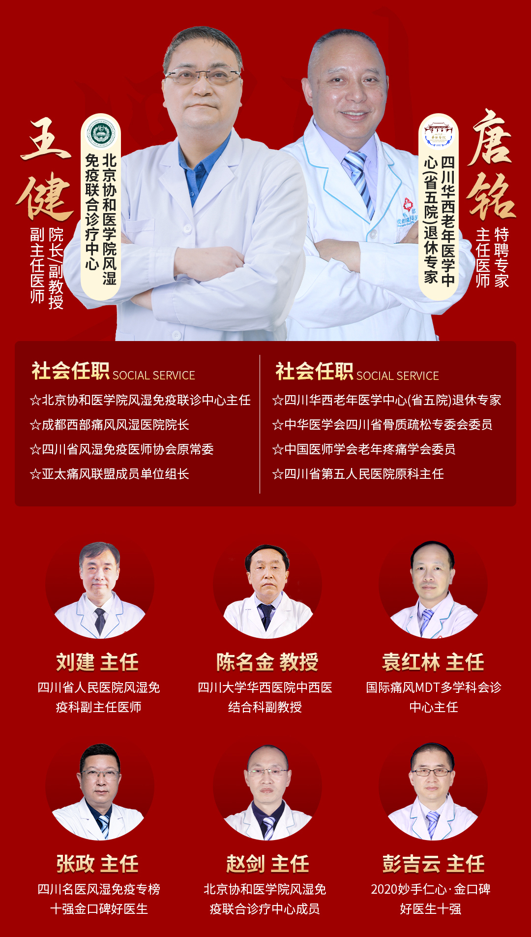届时,北京大学国际医院高辉博士、北京协和医学院风湿免疫联合诊疗中心主任王健院长、四川大学华西医院老年医学中心(省五院)退休老专家唐铭主任将领衔MDT多学科会诊中心专家团,为患者精准检查,确诊病情,制定个性化的诊疗方案。希望大家都能在年前看好病,健康过好年!